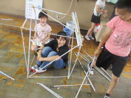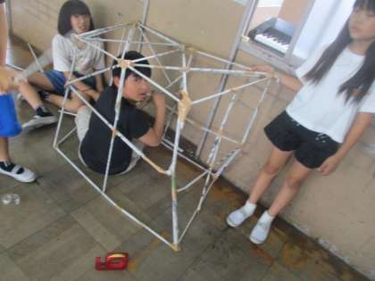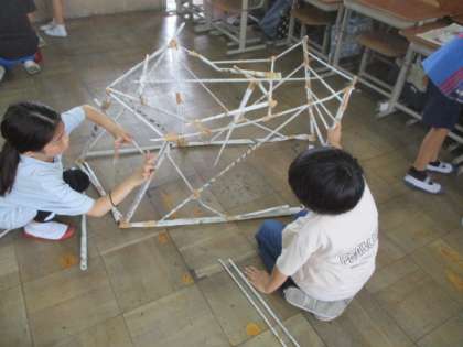 図画工作科「つなぐんぐん」の学習では,細長く丸めた新聞紙の棒をつなぎ合わせて,様々な形の立体物を作りました。