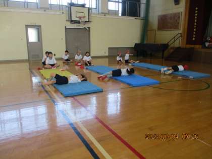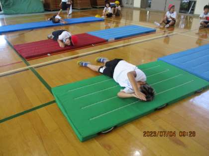 コロコロとマットの上を転がります。みんなで「おいもコロコロ」と言っています。先生の笛の合図でピタッと止めるゲームをしました。意外と難しい!