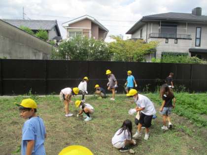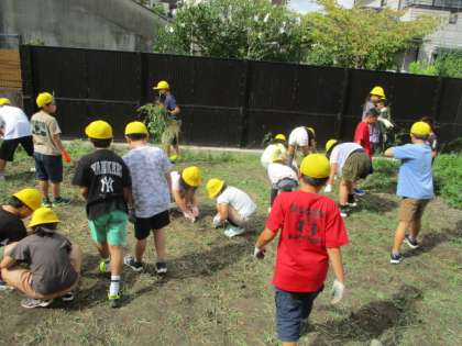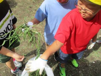先週には,生い茂った畑の雑草を協力して抜き,今日は,耕した畑に種を植えました。