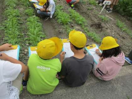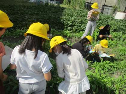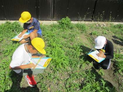 先月に種まきをした水菜と壬生菜が大きく育ってきました。子どもたちは,それぞれの様子の違いを観察し,おいしく育つために自分たちにできることを考えました。「全体にまんべんなく水やりをする」「雑草を抜いて,栄養がいきわたるようにする」「水菜や壬生菜のおいしい育て方を調べる」など多くの意見が出ました。
