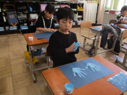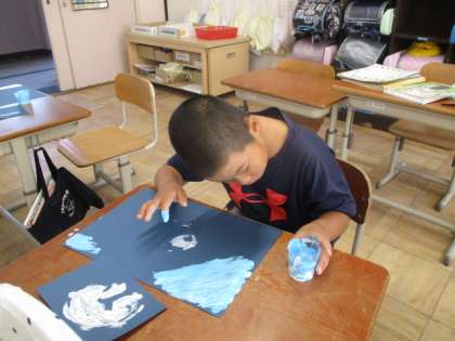 図画工作科の学習で、液体粘土を使い絵を描きました。とろとろした感触を楽しむ活動でもあり、手にいっぱいつけて絵をかきました。