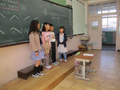 音楽「かねがなる」の学習では、くりかえしの旋律の面白さを学習して、班ごとに発表してみました。きれいな鐘の音を表現できました。