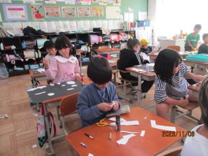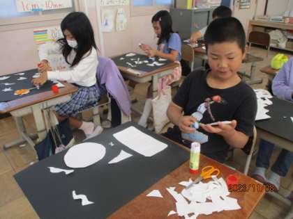 白い画用紙を黒い画用紙に貼って作ると、すてきな「アート」になりました。