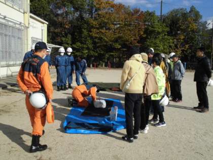 本日、14時より上鳥羽小学校で、上鳥羽自主防災訓練が行われました。南消防署、上鳥羽消防分団、南区役所の方々のご指導のもと、各町内の方々が3つのブースに分かれて訓練を行いました。
