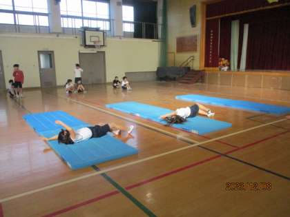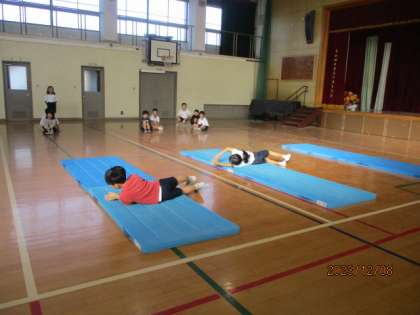 体育は、久しぶりにマット運動の復習をしました。最初は簡単な転がり運動やブリッジをしました。後半は、前回りや後ろ回りをきれいに回ることがみんなの目標です。
