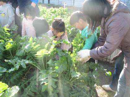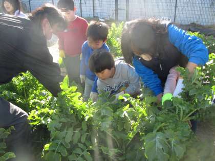 大きく育った聖護院大根を収穫したり、自分たちで育てた聖護院大根を調理したりして、
