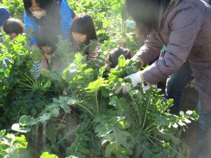 地域の農家の方に教えていただきながら育てていた聖護院大根を収穫しました。