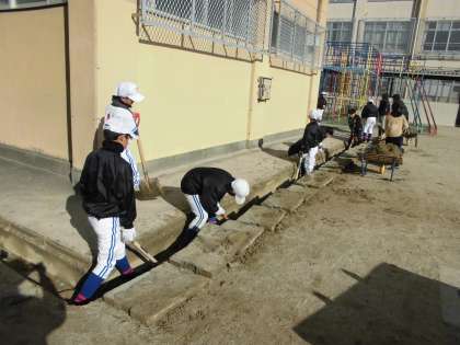 溝掃除では、運動場の溝にたまった砂や泥をかき出して、水たまりがよくできるところを埋めていきました。