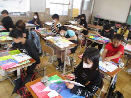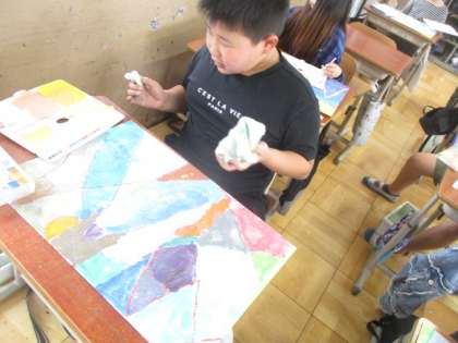 子ども達は、4年生の時に学習した技法なども使って、自分なりに喜びや怒り、悲しみなどの気持ちを表現していました。