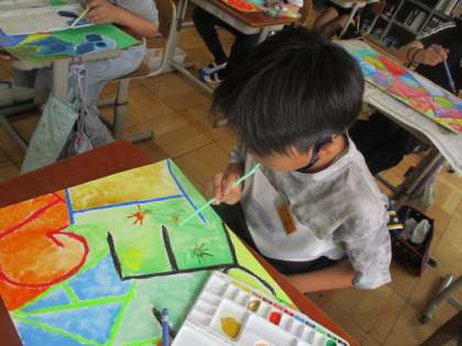 図画工作科の学習では、様々な気持ちを表すために色や模様を工夫して描きました。