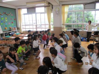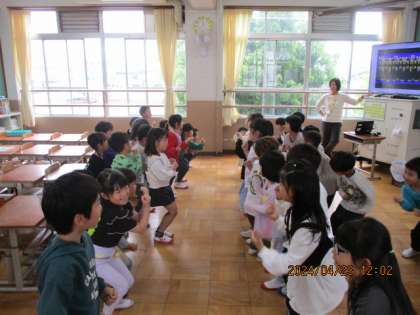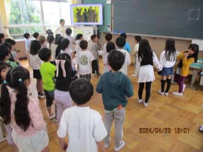 音楽の学習では、はやりの歌に合わせてみんなで体を動かして楽しみました。