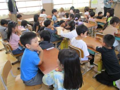 学校探検へ行くために,1年生と2年生で顔合せをしました。