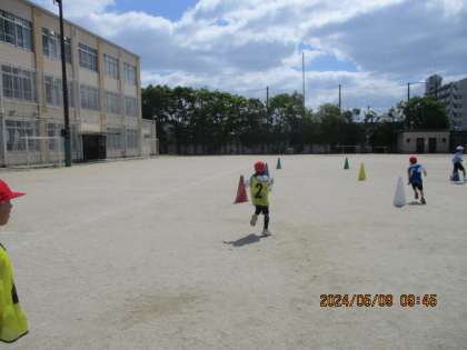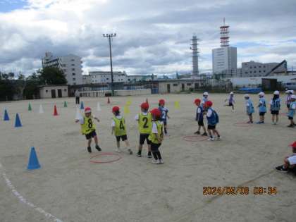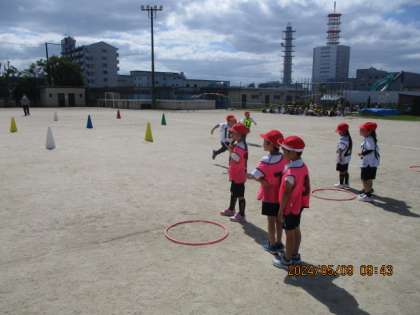 みんなでリレーを楽しみながら学習しました。フープまで戻ってきたら、次の人が走ります。すぐにスタートができるように、集中して取り組んでいました。