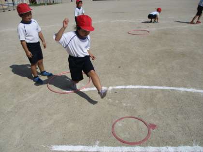 リズムよく跳んだり、片足で跳んだりと色々な工夫がありました。