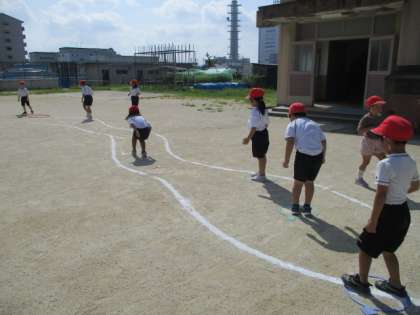 線で書いた川を色々な跳び方で工夫して、楽しく跳んでいました。