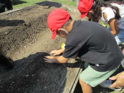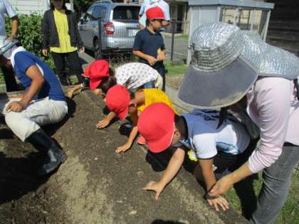 種まきの仕方を教えてもらい、頑張って植えていました。