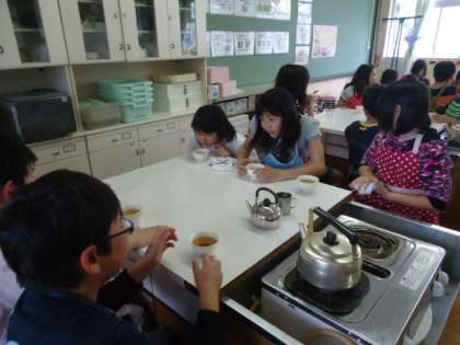 5月7日の家庭科では,初めて家庭科室でガスを使ってお湯を沸かしました。そして,急須を使って自分たちでお茶をいれました。普段からよく口にしているお茶ですが,自分でいれてみると,「おいしい。」「ちょっと苦いけど,その中に甘さがある。」「家でもやってみたい。」など様々な声が聞かれました。お茶を飲み,みんなでほっとしたひとときでした。