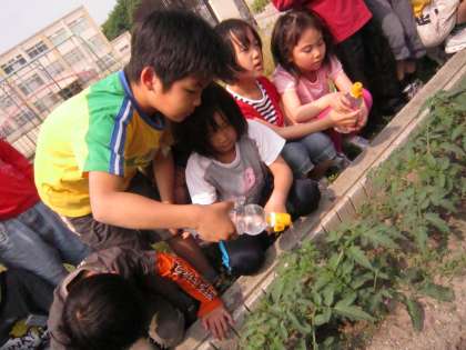 生活科の学習でトマトを植えてからおよそ一ヶ月がたちました。今日は,みんなで水やりをしながら,トマトの苗の成長の様子を観察しました。