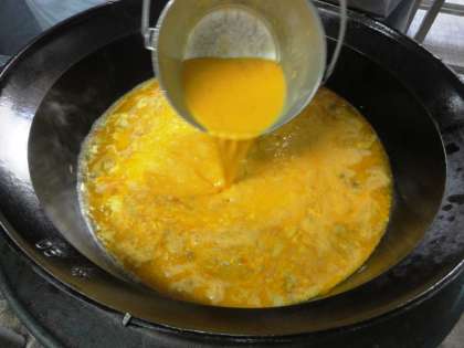 本場はフライパンの形のまま丸く焼上げますが,給食室では,大きな釜で作るので蒸らすように加熱してふっくらと仕上げました。(このたまごの量をみてください!)