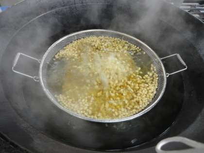 大豆は,やわらかくなるまで時間がかかるように思われますが,給食室では当日,びっくり炊きで煮て作ります。
