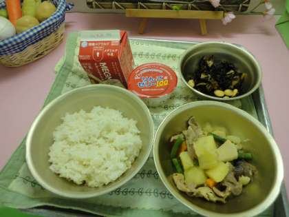 ・麦ごはん・牛乳・煮つけ・ひじき豆・りんごゼリー