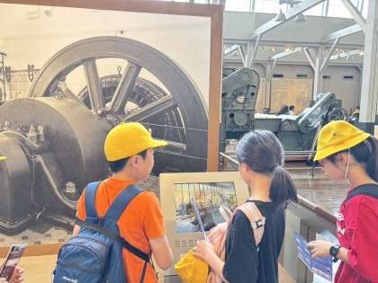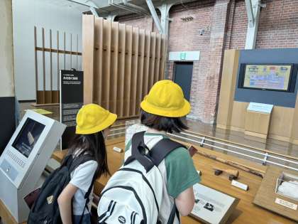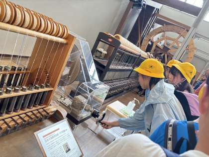 トヨタ産業技術記念館で時代ごとの織り機などを体験しながら学んでいます。
