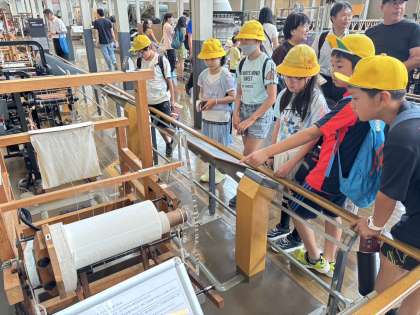 子どもたちは、時代ともに進化していく織り機の様子に感心しなから見学しています。