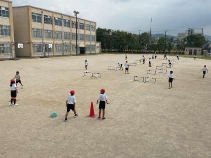 4年生体育科では、ハードル走に挑戦しています。自分に合ったハードルの感覚をつかみます。ハードルや場の設定は、みんなで協力し合って準備しています。かけ合う声がグラウンドに心地よく響きます。