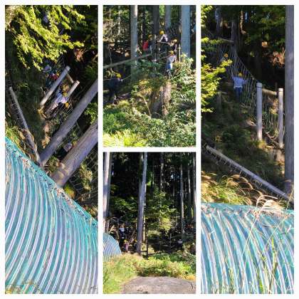 昼食を終え、冒険の森アスレチックに挑戦しています。みんなで声をかけ合い、支えあって進んでいます。