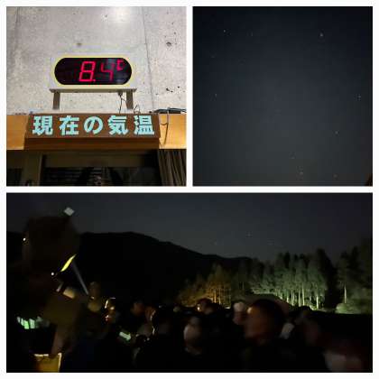 気温も低く、空気がきれいなので星もよく見えます。所員さんから星のお話を聞いた後、天体望遠鏡で全員順番に星や月を観察します。流れ星も見えました。