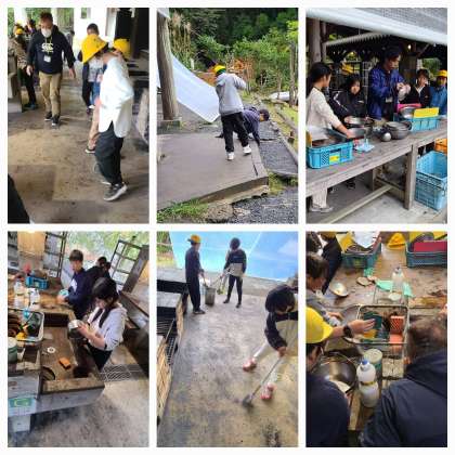食事が終わった後は後片付けです。使った食器や道具をきれいに洗ったり、かまどや炊事場をきれいに掃除したりしました。自分の担当が終わっても、他にやるところはないか探して主体的に行動できる人の姿もありました。