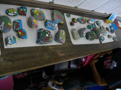 みさきの家の思い出を石にかきました。宮崎浜で拾った石の上には思い出がいっぱいです。家に持って帰ったら大切にかざってくださいね。