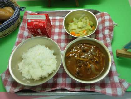 今日の献立 ごはん・牛乳・ハッシュドビーフ・野菜のソティ