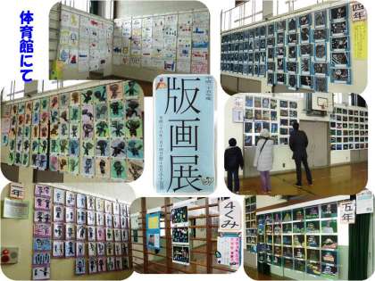 昨日と15日(土)の午前中,17日(月)8:50〜16:30まで体育館で校内版画展を開催しています。昨日の初日は大雪にもかかわらず,参観いただきました。本日の土曜日も午前中でしたが,多くの方が,ご家族おそろいで,鑑賞に来て下さいました。力作ぞろいです。明日の16:30まで開催していますので,お越しをお待ちしております。
