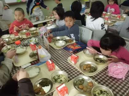 18日(火)の給食は「たてわりグループ」で給食をいただきました。いつものクラス人数の配膳と大きく変わるので,事前に給食調理員さんとの打ち合わせも念入りに行っての実施です。