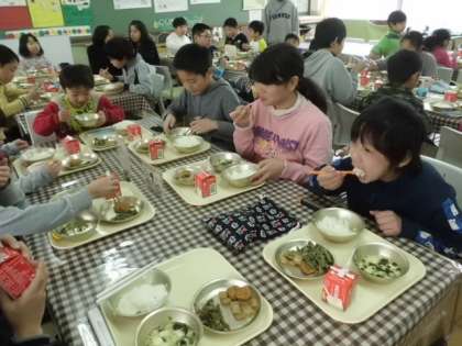 いつもの雰囲気と違う食事も良いものです。何度か実施しましたが,みんな大喜びです。6年生のみんなは,残り少なくなった給食を下級生と話しながら,味わっていました。