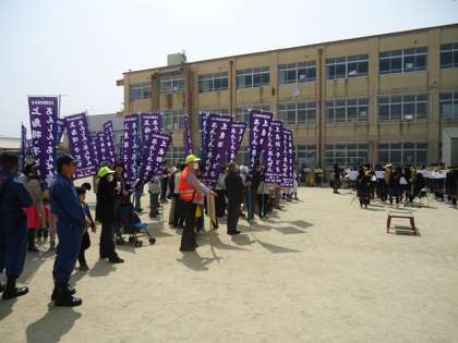 春にふさわしい暖かな日となった12日(土)の午前,恒例になった上鳥羽こどもあんしんあんぜんパレードが学区の東向公園から上鳥羽小学校までのコースで行われました。南消防署・南警察署の関係機関をはじめ消防分団および洛南中学校吹奏楽部の全面協力で素晴らしいパレードになりました。中学校の吹奏楽部の皆さんにはパレード中だけでなく,結団式での演奏披露も行っていただきました。