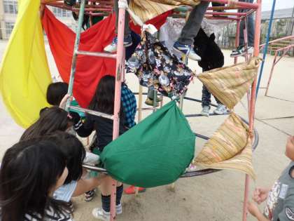 教室に引き続き,今日は遊具やブランコ,うんていを布でかざりました。布の形や色を考えながら,みんなで協力して上手にかざりつけることができましたね。