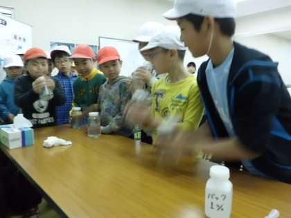 見学が終わった後は,様々な実験をさせていただけました。ろ過急速地のろ過の様子が分かりやすいように小さな模型を使って見せていただいたり,原水に薬品を入れてフロックを形成する体験をさせていただいたりと浄水場の行程を更に身近に感じることができました。