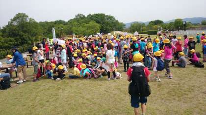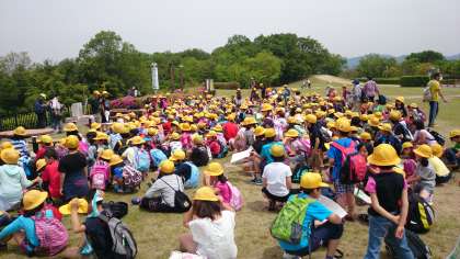 太陽が丘に到着しました。芝生広場にて,たてわりラリーの説明です。いよいよ1年生から6年生のたてわりグループが,力を合わせてのラリーです。