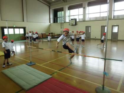 体育では,たかとびの学習が始まりました。自分で目標の高さを設定し,より高く跳ぶことができるように練習しています。