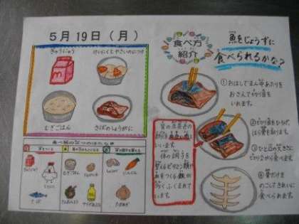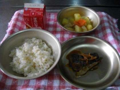 月曜日の献立は 「麦ごはん、牛乳、サバの生姜煮、鶏肉と野菜の煮つけ」 でした。生姜と醤油の味がよくしみこんで、ごはんがすすむ 美味しい和食でした。
