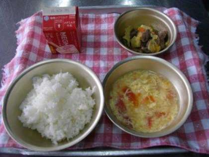 そして今日の献立は、 「ご飯、牛乳、焼肉、トマトと卵のスープ」