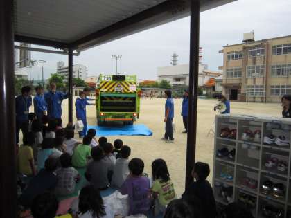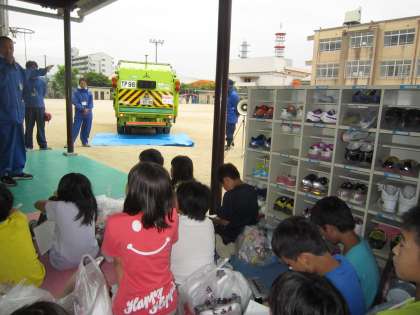 いよいよお待ちかねのパッカー車の登場です。パッカー車を見せていただきながら,構造を教えていただきました。大迫力に歓声があがっていましたね。