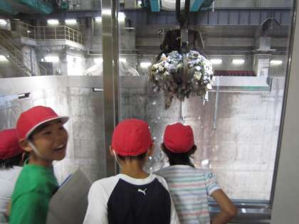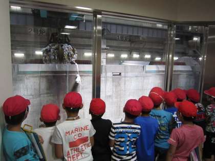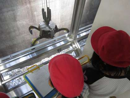 さてまず初めに見学させてもらったのは,ごみクレーンです。パッカー車で運ばれたごみは,ごみピットに運ばれます。ごみピットにためられたごみは,ごみクレーンでつかんで,混ぜ合わせます。これは,燃えやすいように工夫していることも教えてもらいました。ごみクレーンの迫力に驚きの子どもたちでした。
