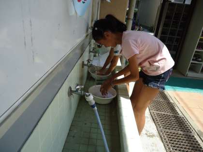 家庭科で洗濯の実習をしました。洗濯板を使ってみたいという子どももいてとてもがんばっていました。