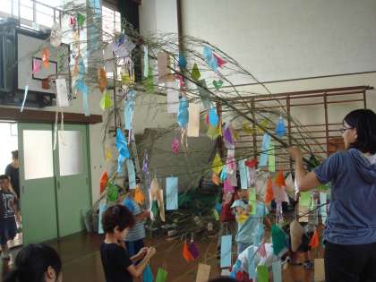 願いを書いた短冊と,折り紙で作った飾りを笹に飾りました。