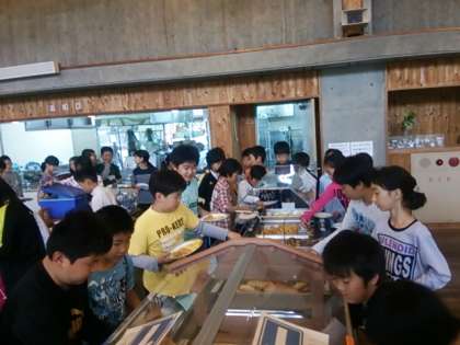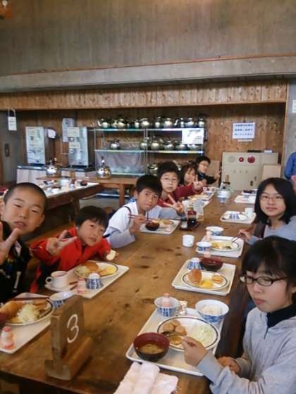 お待ちかねの朝食です。お皿にバイキング料理をしっかり盛っています。今日は,地面がぬかるんでいるので,昼までの登山コースに行きます。午後からはボルダリングです。