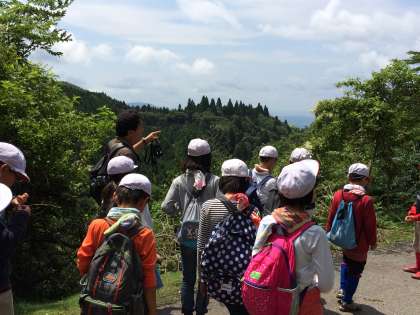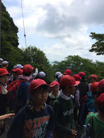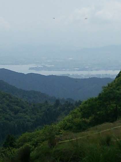 花背峠に到着しました。遠くに琵琶湖も見えます。暑い中ですが,頑張っています。