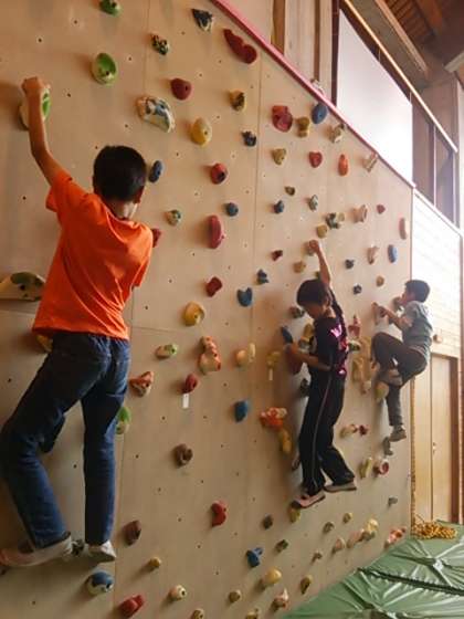 プレイホール内にあるボルタリングに挑戦中です。想像以上に体力が必要です。みんな,上まで登れるかな?